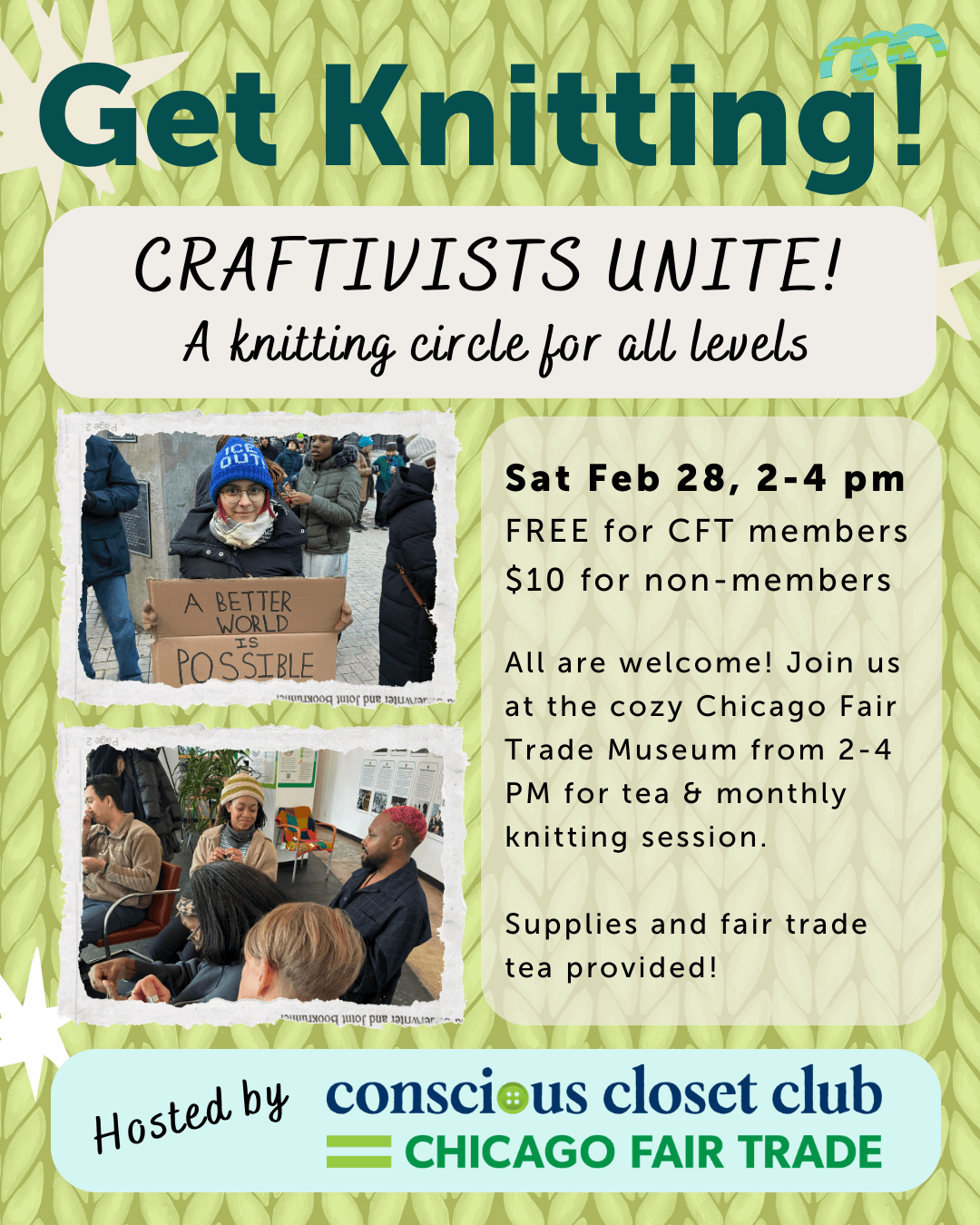 Beginners and seasoned stitchers alike are invited to join Chicago Fair Trade’s cozy craftivist knitting circle!