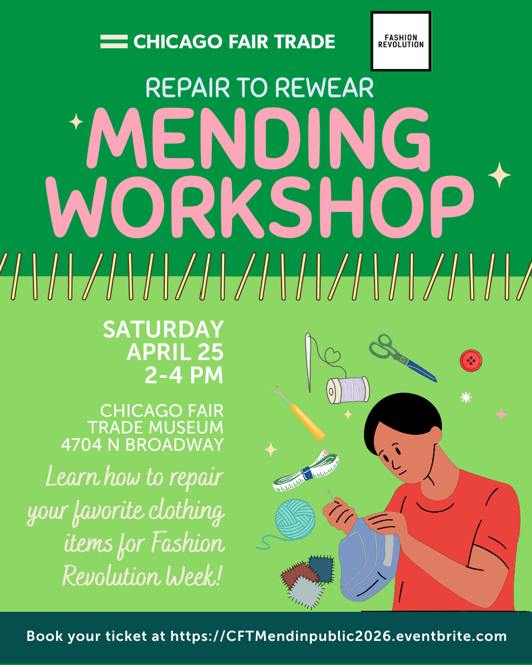 Join Conscious Closet Club at the Chicago Fair Trade Museum for a special session of Mend with Friends as part of Fashion Revolution. Together, we’ll stitch, chat, and take collective action during Mend in Public Day, an initiative of the world’s largest fashion activism movement, Fashion Revolution. Established in 2013 following the Rana Plaza factory collapse in Bangladesh, Fashion Revolution campaigns for a sustainable, transparent, and fair fashion industry free of worker and environmental exploitation.