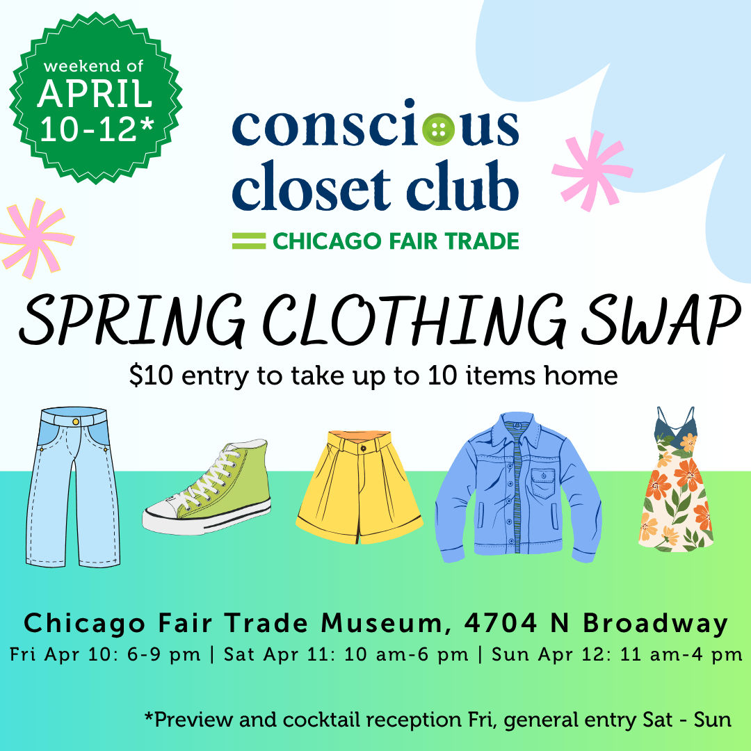 Join Chicago Fair Trade’s Conscious Closet Club for a weekend-long clothing swap at the Chicago Fair Trade Museum. We welcome swappers of all ages, sizes, and genders to this ever-popular fan favorite event.