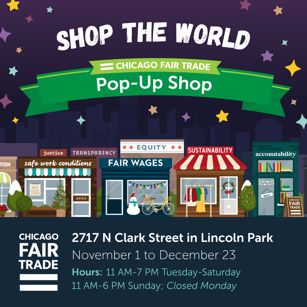 Chicago Fair Trade’s Holiday Pop-Up Shop offers a curated selection of fair trade, eco-friendly products from over two dozen local businesses. Find one-of-a-kind holiday gifts that create a positive impact on communities locally and globally, featuring everything from gourmet treats and cozy apparel to elegant home décor!